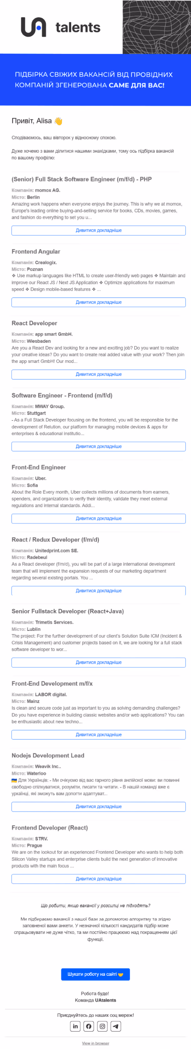 Технічні пояснення: унікальні листи з 54 змінними, нотифікації менеджерам про теплі контакти.
